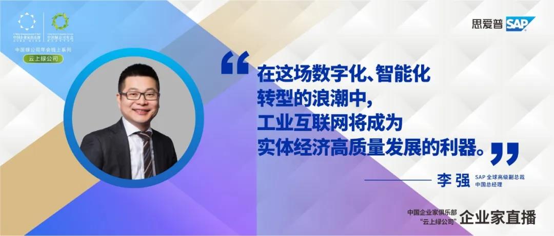 由中國(guó)企業(yè)家俱樂部主辦的“云上綠公司”于5月19日19:00-20:30再次舉行。中國(guó)綠公司聯(lián)盟成員、SAP全球高級(jí)副總裁、中國(guó)總經(jīng)理李強(qiáng)進(jìn)行了一場(chǎng)主題為《跨越數(shù)字鴻溝,“工業(yè)互聯(lián)網(wǎng)”按下企業(yè)發(fā)展快進(jìn)鍵》的直播,并與網(wǎng)友進(jìn)行了熱烈的互動(dòng)。