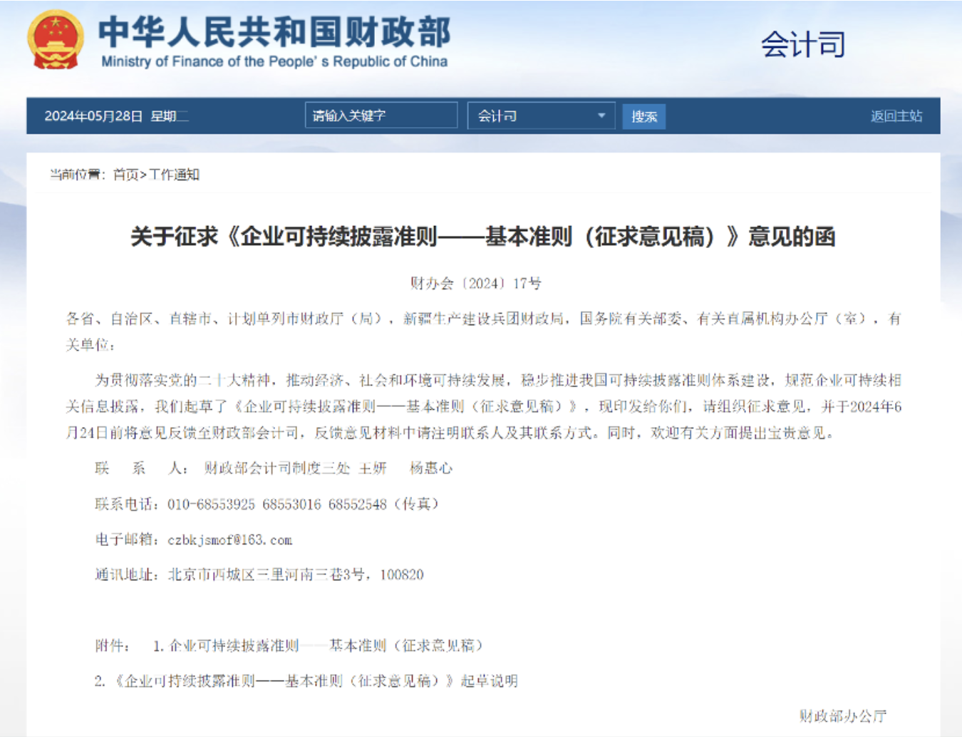 財政部5月27日發函,就《企業可持續披露準則——基本準則(征求意見稿)》征求意見。《意見稿》提出,到2027年,我國企業可持續披露基本準則、氣候相關披露準則相繼出臺;到2030年,國家統一的可持續披露準則體系基本建成。