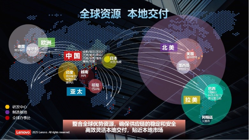卓越運營的另一個優勢就是“全球資源、本地交付”。一方面,全球化就是哪兒的資源最有競爭力,就用哪兒的資源。 另一方面,聯想也早早意識到了本地化的重要性,打造了貼近本地市場的營銷、交付和服務,面向客戶實現本地化的“最后一公里”,既能夠達到更高的客戶滿意度,更好地合規和利用各地政策,也有助于打造更加韌性、安全的供應鏈。