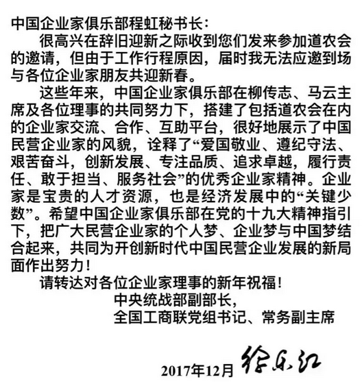 2018年道農會于1月19日于北京落下帷幕。中央統戰部副部長,全國工商聯黨組書記、常務副主席徐樂江也來函向在場的企業家們送上新年祝福: