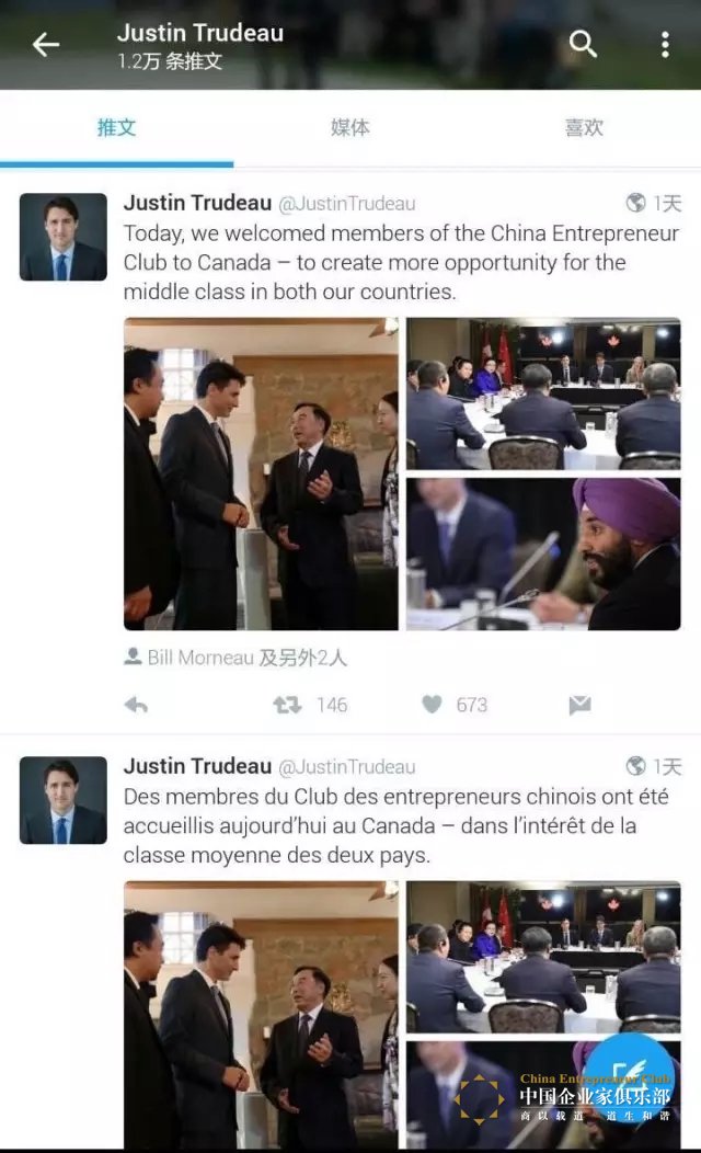 在會面結束后不久,特魯多總理便在其推特賬號和新浪微博賬號上公開表示對中國企業(yè)家俱樂部的歡迎和對中加合作的熱情:歡迎中國企業(yè)家俱樂部代表來到加拿大,也為兩國的中產(chǎn)階級創(chuàng)造更多機會!