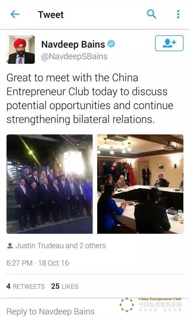 在當天會面結束后,兩位重要內(nèi)閣成員也在其個人推特賬戶上表示對中國企業(yè)家俱樂部的歡迎和中加合作的熱情: