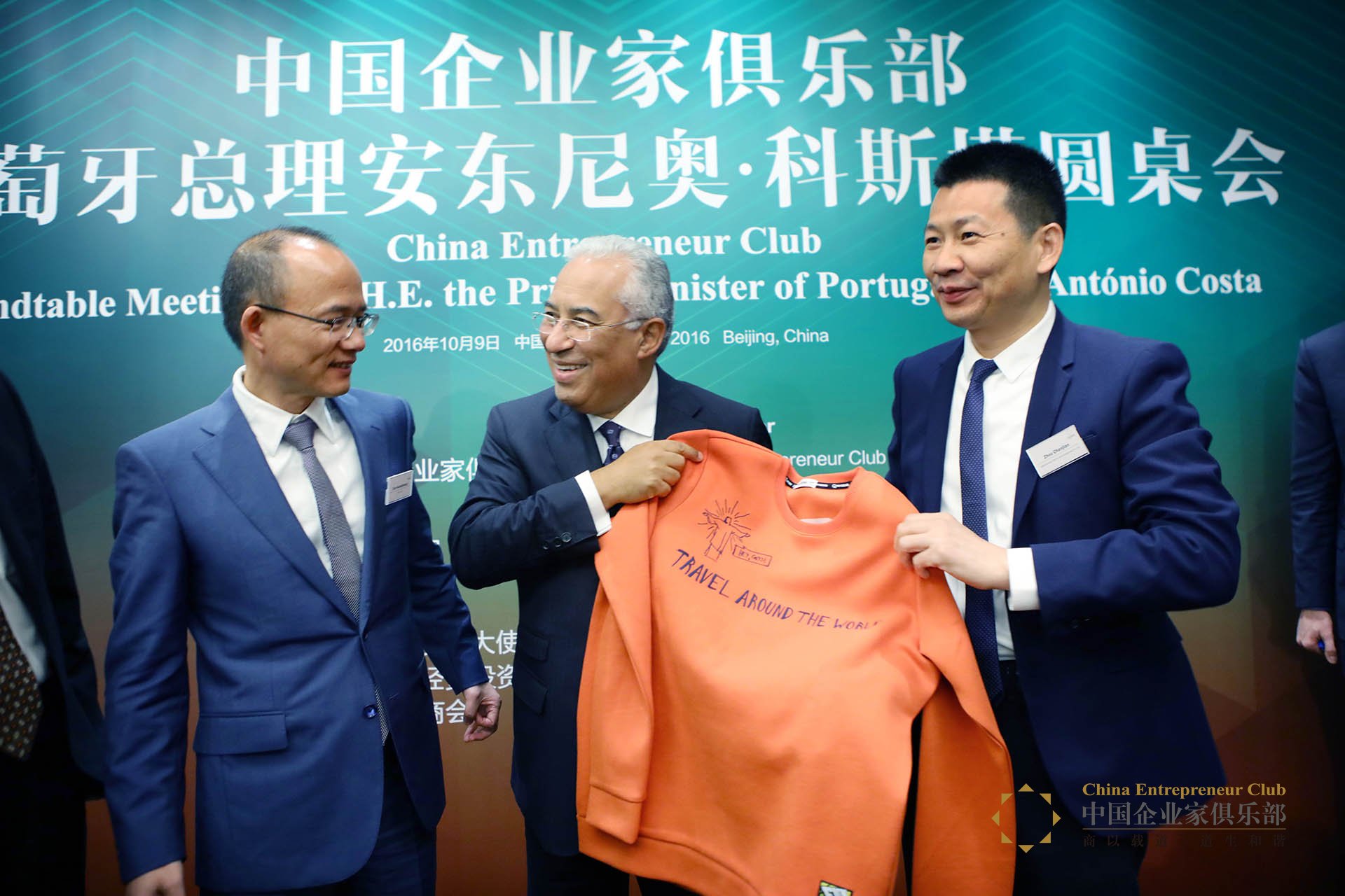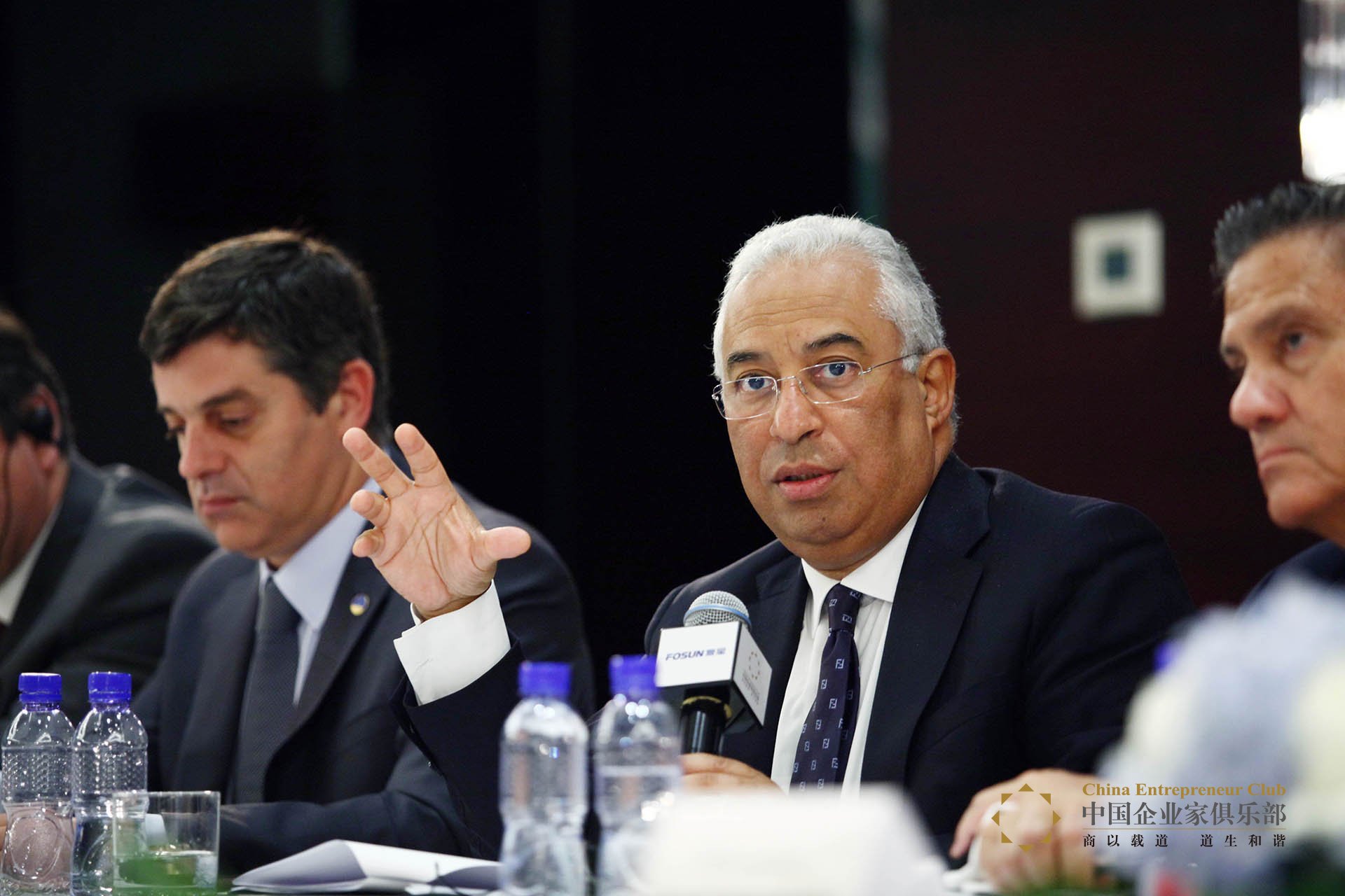 10月9日上午,正在中國訪問的葡萄牙共和國總理安東尼奧•科斯塔一行出席了由中國企業家俱樂部舉辦的圓桌對話會。中國企業家俱樂部副理事長、新希望集團董事長、中國民生銀行副董事長劉永好主持圓桌對話。中國企業家俱樂部副理事長、復星集團董事長郭廣昌,以及中國企業家俱樂部理事代表美特斯邦威服飾集團董事長周成建,上海均瑤(集團)有限公司副董事長兼總裁王均豪,依文集團董事長夏華,中國企業家俱樂部秘書長程虹等參加了圓桌對話會。葡萄牙政府代表團一行還包括葡萄牙經濟部長曼努埃爾•卡布拉爾,葡萄牙駐華大使佩雷拉,葡萄牙國際事務國務秘書高德志等人。